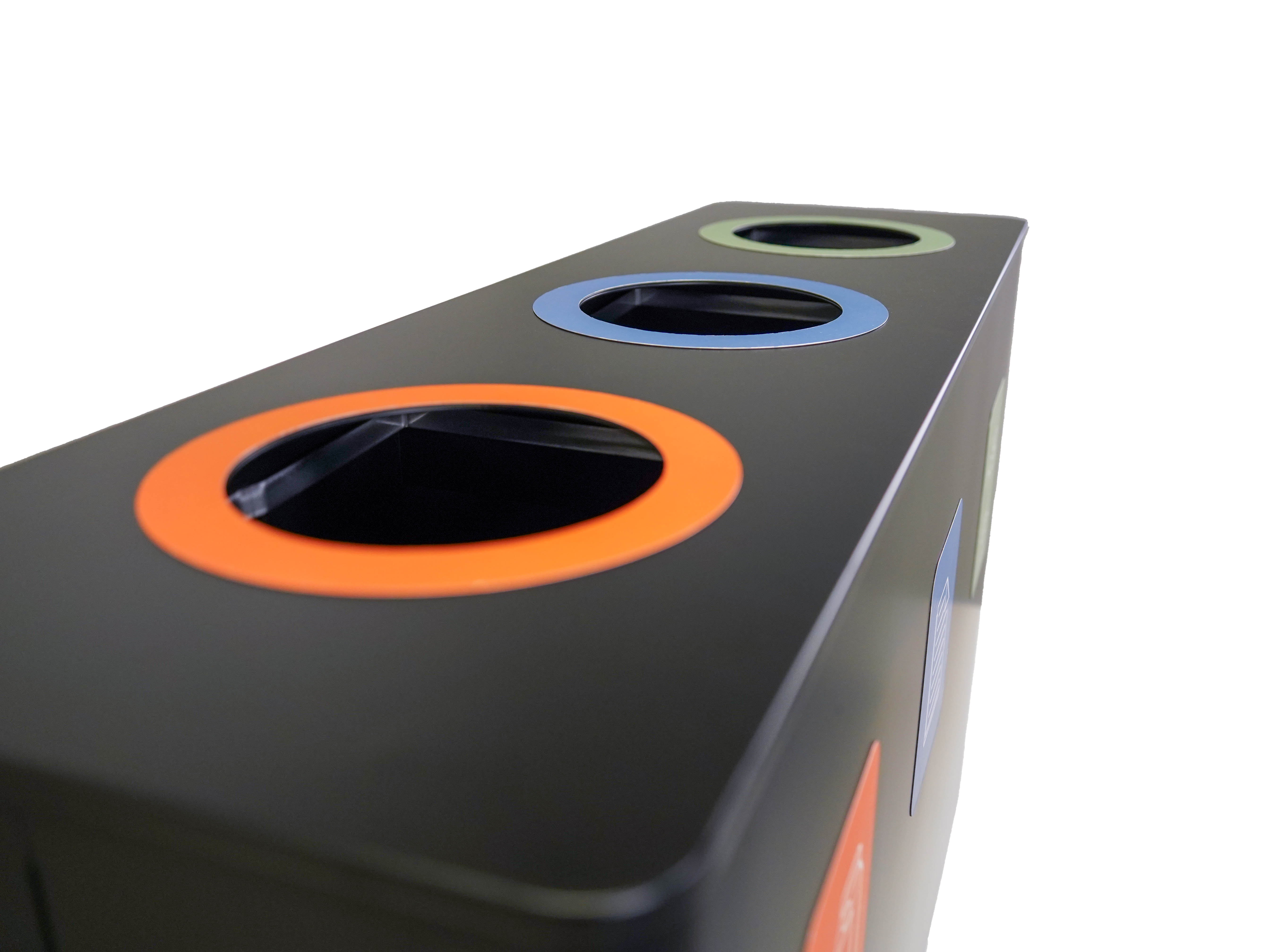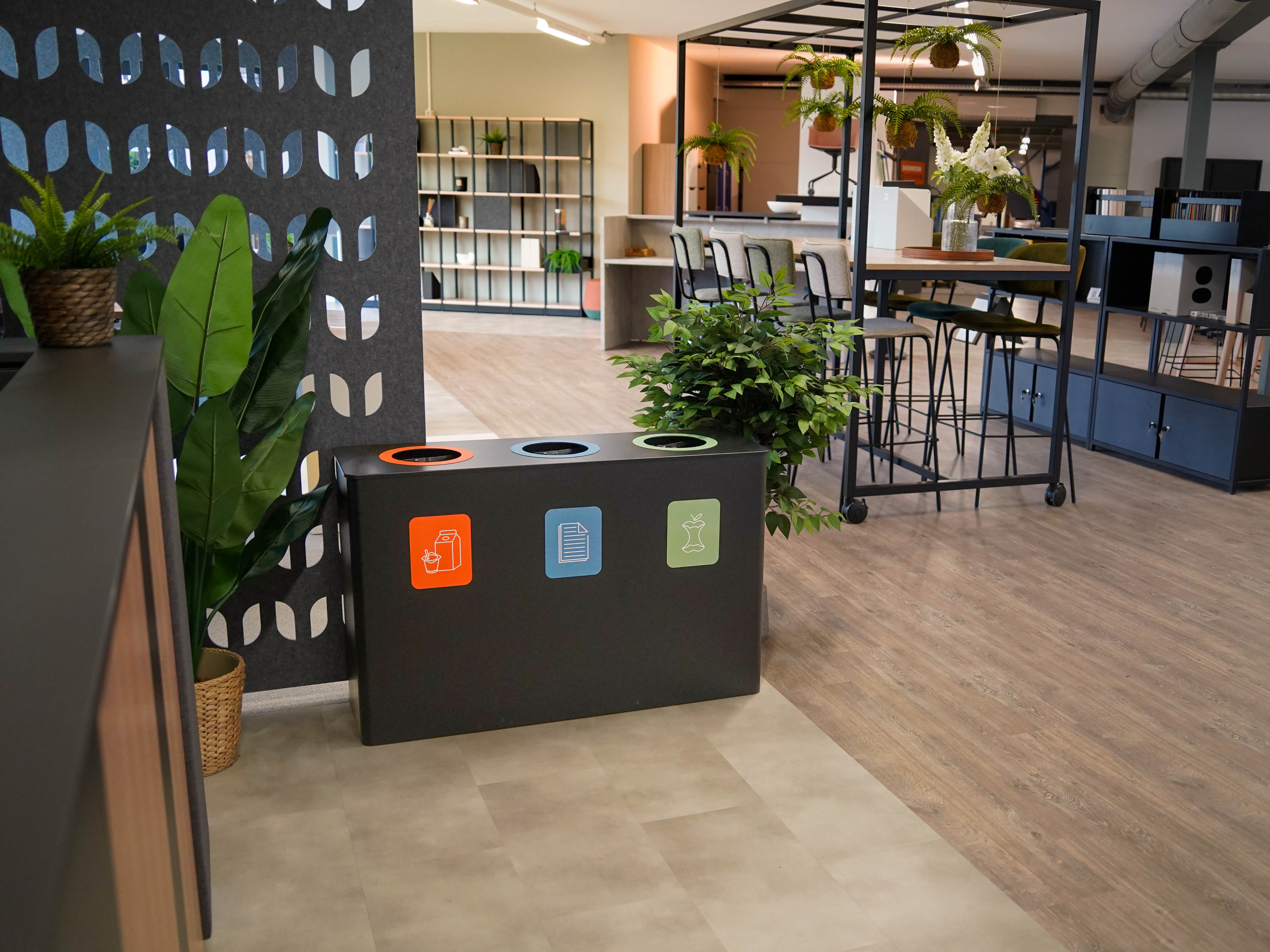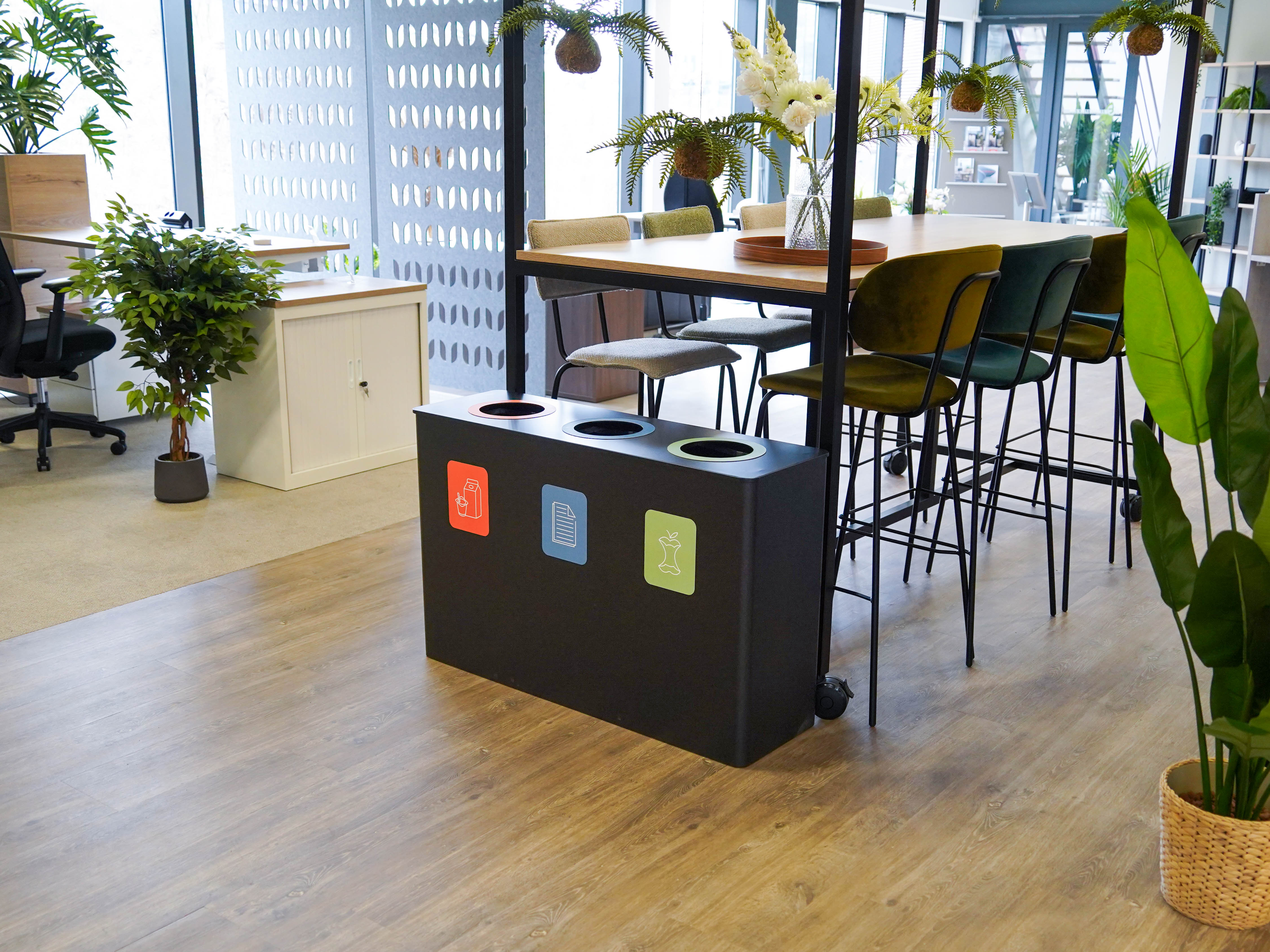 Moderne 3-vaks afval scheidingsbak maakt afval scheiden eenvoudig en overzichtelijk. Door het strakke ontwerp is hij een mooie aanvulling op iedere kantoorruimte, pantry of kantine. Uitgevoerd met een kantelbaar deksel.